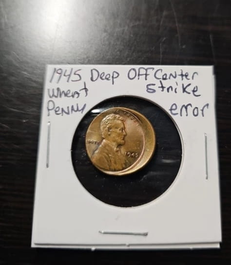 The 1945 penny off-center strike error results from misalignment between the planchet and dies during striking, causing the design to be struck away from the coin's center. A portion of the design extends beyond the planchet edge while part of the blank remains visible. These errors became more common during 1945's intensive wartime production schedules when feeding mechanisms occasionally malfunctioned under constant high-speed operation.