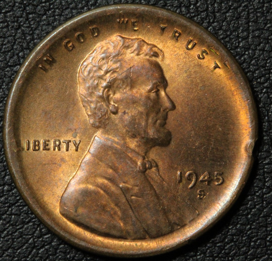 The 1945 penny clipped planchet error occurs when the metal planchet is positioned incorrectly during the blanking process, resulting in a coin with a missing curved or straight section along its edge. These errors happen when planchets overlap during cutting from the metal strip, or when a planchet is punched too close to the strip's edge. The high production demands of 1945 occasionally led to quality control oversights that allowed clipped planchets to reach the striking presses.