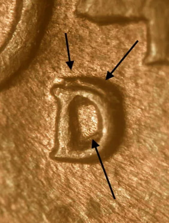 Identification Tips: Examine the mint mark below the date with at least 10x magnification. Look for doubling, tripling, or spreading of the D or S mint mark. Traces of earlier punch impressions may appear as shadows, extra serifs, or thickened portions of the letter. The repunching is most commonly found on 1945-D and 1945-S varieties. Check for tilted or offset secondary impressions around the primary mint mark. Some repunched mint marks show the earlier impression clearly separated from the final position. Others show as a general thickening or spreading of the mint mark. Compare to photos of known RPM varieties for your specific year and mint mark. The repunching should be consistent and show the characteristics of the punch tool rather than appearing as simple doubling.